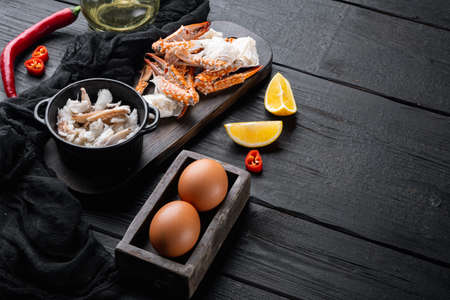 Chilli crab silky omlette ingredients set, on black wooden table background, with copyspace and space for text