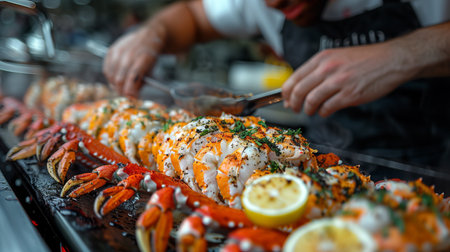 Culinary expert skillfully prepares a seafood platter with grilled lobster and shrimp, garnished with fresh herbs and lemon, highlighting the art of cooking in a bustling kitchen
