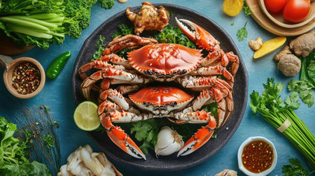 A vibrant display of fresh crab accompanied by a variety of colorful ingredients, perfect for cooking enthusiasts and food photography.