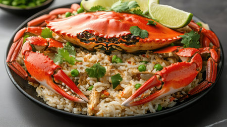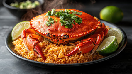 A mouthwatering crab served on a bed of steamed rice, garnished with fresh herbs and lime, showcasing vibrant colors and textures for an appetizing dining experience.