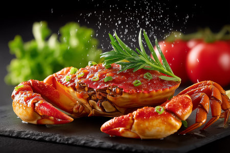 Cracked chilli crab claws showcase thick red sauce splashing across black slate. Fresh tomatoes and greens create vibrant setting. Concept of seafood restaurant, culinary arts, food photography.
