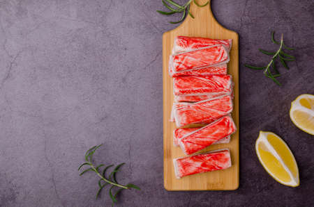 Crab meat sticks with lemon and rosemary. Top view. Selective focus.
