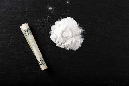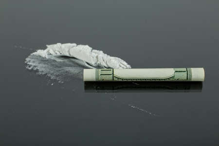 Rolled dollar and dose of cocaine in addict hands