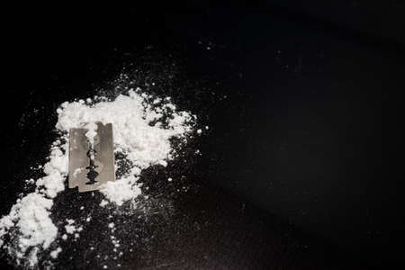 Razor Blade on drug powder on reflection black background.Copy space.
