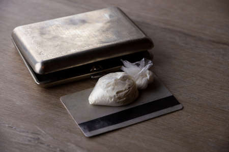 dose of cocaine in a plastic bag and a card near the old cigarette case, side view, contrast enhancement