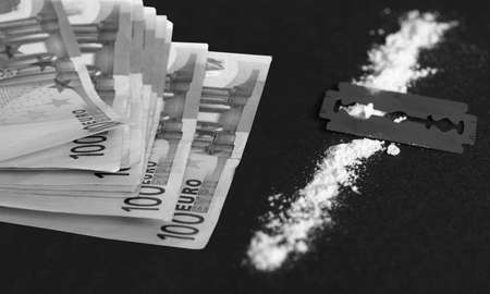 Cocaine, razor blade and money (simulation using wheat flour, no actual drugs used)