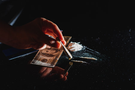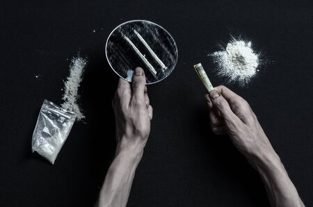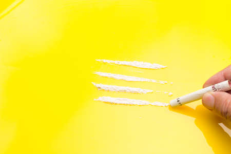hand holding money straw to inhale a portion of cocaine, white powder to be inhaled, concept of addiction and drug addiction, dealer and sale of drugs