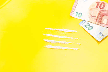 cocaine or speed in a line. addict with euro bill for snorting, drug abuse concept close-up