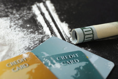 Cocaine, credit cards and rolled dollar banknote on black background