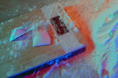 Drugs, drug dealer house. Cocaine packaged in sachets, scales: tablets and syringes in neon light. Illegal, entry.