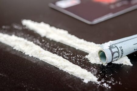 White powders, lines of white powders, addictive, dangerous and illegal drug. Traffic in dangerous substances, mafias. Drug trafficking, substance use. Consumption of drugs. Drug addiction.