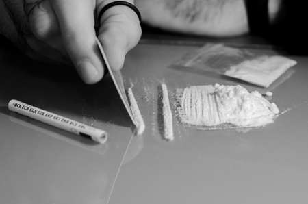 Caucasian man divides the cocaine into strips, so that he can snort it later. Concept of narcotics, addictions. High quality photo