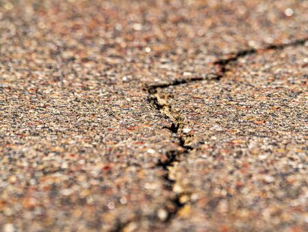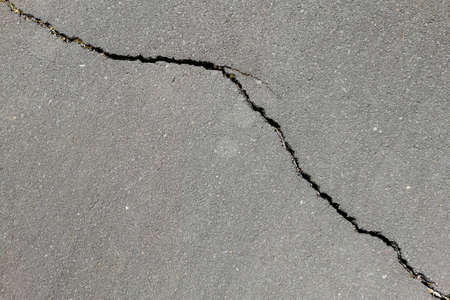 Closeup of a longitudinal crack in the asphalt pavement of a highway. Place for text. Background image. Texture.