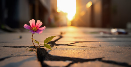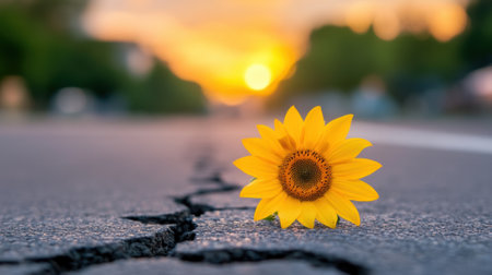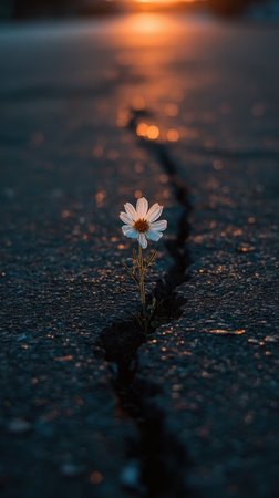 A lone daisy pushes through a deep crack in a dark asphalt road, catching the glow of a setting sun. Symbol of resilience, hope, and quiet beauty in urban spaces. Generated A.I.