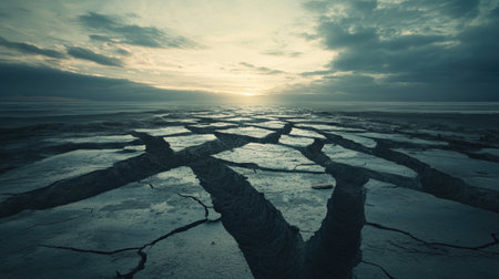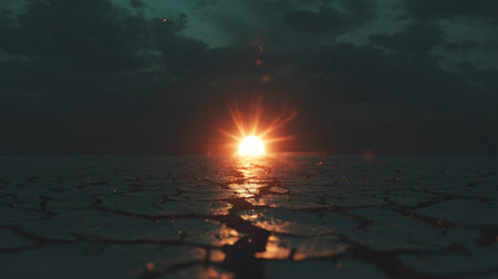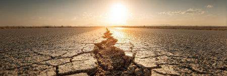 Cracked earth stretches endlessly under a radiant sun, creating a vivid depiction of environmental challenges during the evening hours.