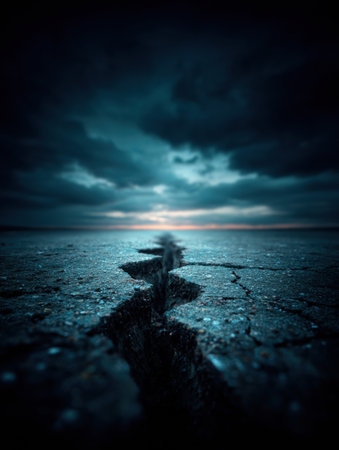 AI Generated. a big crack on a concrete highway close-up view dusk earthquake destruction concept