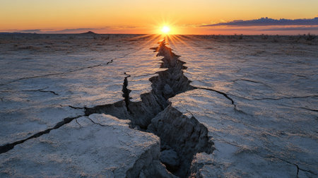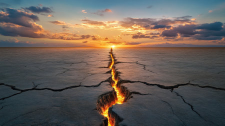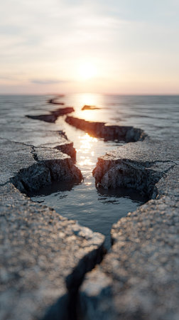 Extreme view focused on a wide, deep crack running through dry, parched ground, likely the result of severe drought or water depletion, set against a backdrop of a soft, warm sunset over a distant body of water and low horizon.