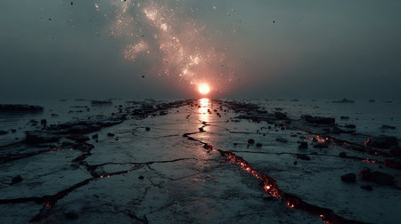 An AI-generated illustration of a scenic winter landscape with a layer of ice beneath a sunset sky