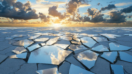 A close-up shot captures a cracked earth formation filled with water, stretching towards the horizon. The setting sun casts a warm glow, highlighting textures and contrasts. The image portrays natural erosion processes under an open sky. Suitable for conceptual illustrations or background elements in various projects.