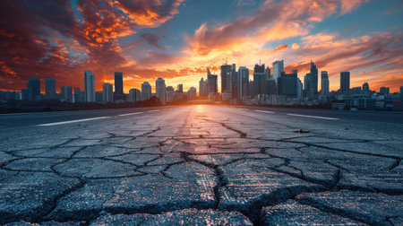 City skyline with modern buildings at sunrise, straight cracked asphalt highway leading the way