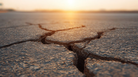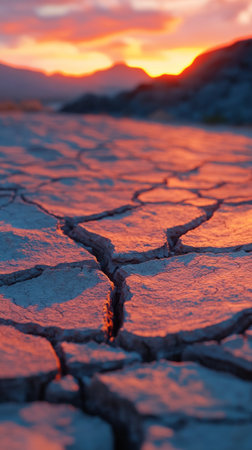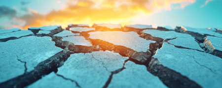 Captivating view of cracked ground under a warm sunset, highlighting the intricate textures and patterns on dry earth, symbolizing environmental challenges and beauty.