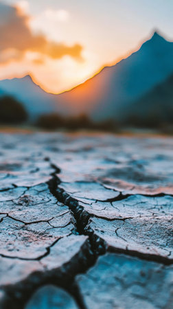 Cracked earth with mountain sunset in the background, nature resilience and climate change concept