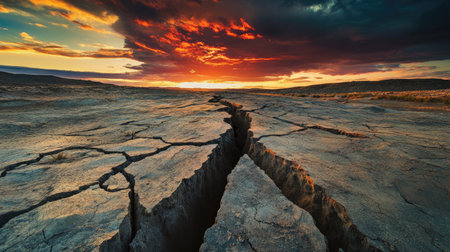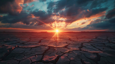 Cracked earth at sunset with vibrant colors and dramatic sky. Environmental and climate change concept