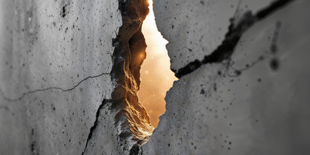 A crack runs through an old wall, illuminated by a faint light, hinting at the presence of a dark void behind it and evoking a sense of curiosity.