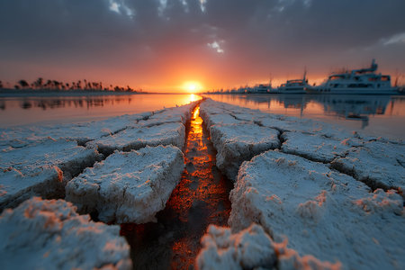 The sun sets over cracked salt flats leading to a tranquil lake, reflecting vibrant orange and blue hues. sailboats rest on the horizon, framed by distant palm trees, creating a serene and picturesque scene. Generative AI
