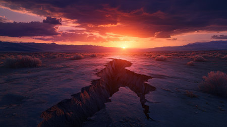 A stunning view of a cracked earth landscape during sunset, featuring vibrant colors in the sky and dramatic geological formations, capturing the beauty of nature.