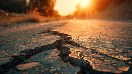 Golden hour light casts over a damaged road, emphasizing the destruction caused by seismic activity.