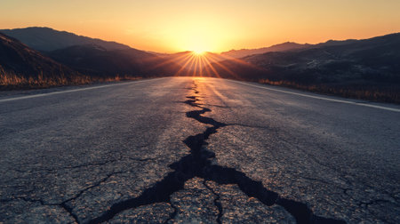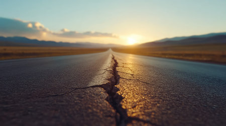 A deep crack runs through the pavement as the sun rises, casting a warm glow over the cracked surface in the early morning light.