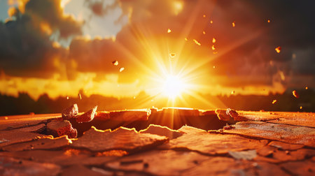 Cracked dry earth under a golden sunset with sun rays breaking through the horizon.