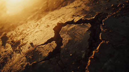 A stunning view of dried earth cracking under intense sunlight during sunset, showcasing the beauty and harshness of an arid landscape filled with texture and warmth.