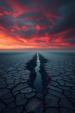 A stunning landscape captures the essence of cracked earth beneath a vibrant and dramatic sky at sunset, showcasing nature's beauty and resilience.