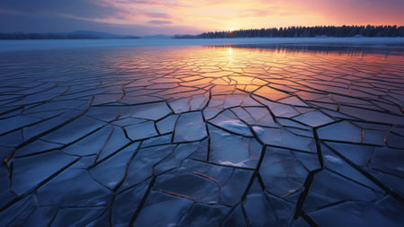 Majestic view of a frozen lake surface at sunset, showcasing intricate ice cracks and beautiful reflections in a tranquil winter setting.