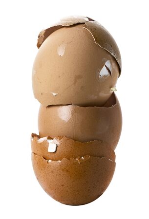 A lot of eggshells, chicken shells after the birth of chicks, a new life for nature, poultry farming on a white background.