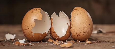 A broken eggshell on a table. The shell is cracked and has bits of egg inside. Concept of fragility and the fleeting nature of life
