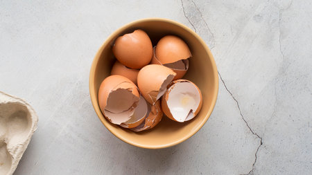 Empty broken eggshells on a white plate over kitchen table. Halved shells of brown chicken eggs close-up. Food product high in protein and natural calcium. Food waste and peelings. Front view.