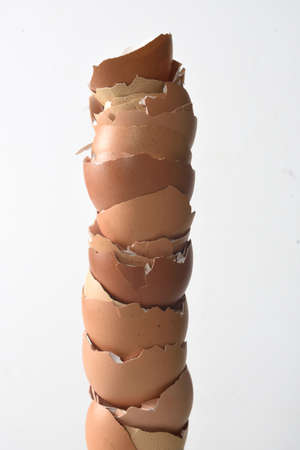 Two rows of broken eggshells stacked on top of each other, close-up blurry on white background.