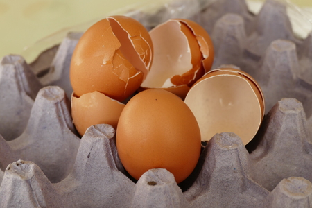 Shell of an egg with many eggshells, and bokeh blurred background.