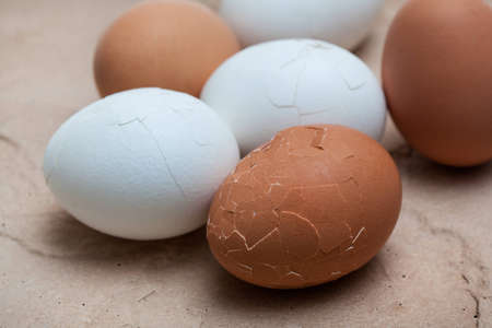 Kitchen food products details concept. Detailed closeup of empty cracked eggshells left after cooking.