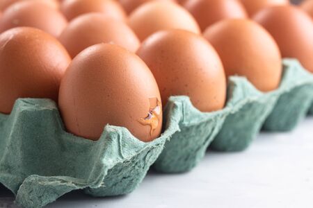 Egg shells in egg box. Close-up view of raw chicken eggs isolated on white background