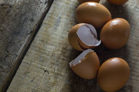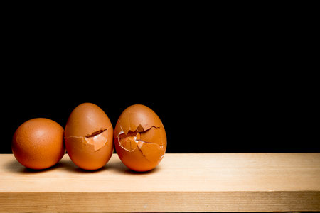 Low light with high contrast lighting of a bunch of eggs whole and crushed shells.