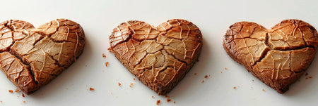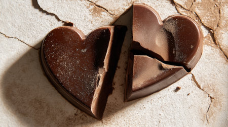 A heart-shaped piece of chocolate lies broken on a cracked surface, symbolizing the duality of love and heartbreak, ideal for romantic and culinary themes.