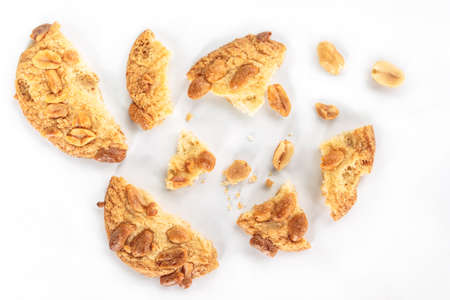 Broken cookies with crumbs isolated on a white background. Delicious baked dessert.