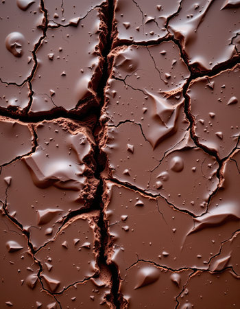 This image showcases a textured dark chocolate surface featuring glistening droplets and intricate cracks. A visual delight for food enthusiasts.