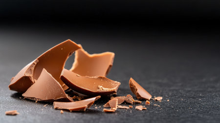 Bits of chocolate shell lying chaotically on a dark, moody surface, dramatic shadows cast