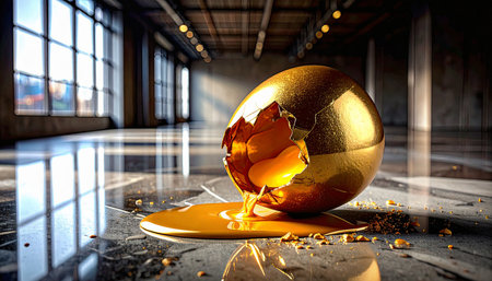 Single golden egg broken open with yolk spilling onto a polished marble surface, representing broken wealth or failed investments, sharp lighting and high contrast