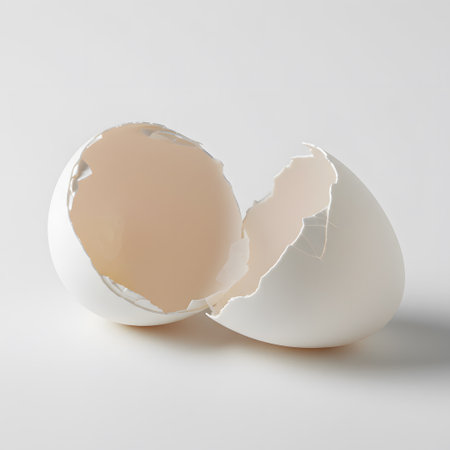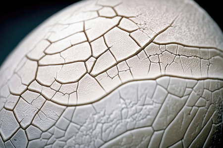 A delicate macro photograph of a shattered white eggshell, where the broken pieces are intricately held together by the translucent inner membrane. The abstract image showcases a beautiful fragility, representing concepts like birth, breakthrough, vulnerability, and new beginnings. The cracks and web-like structure create a fascinating and detailed texture.